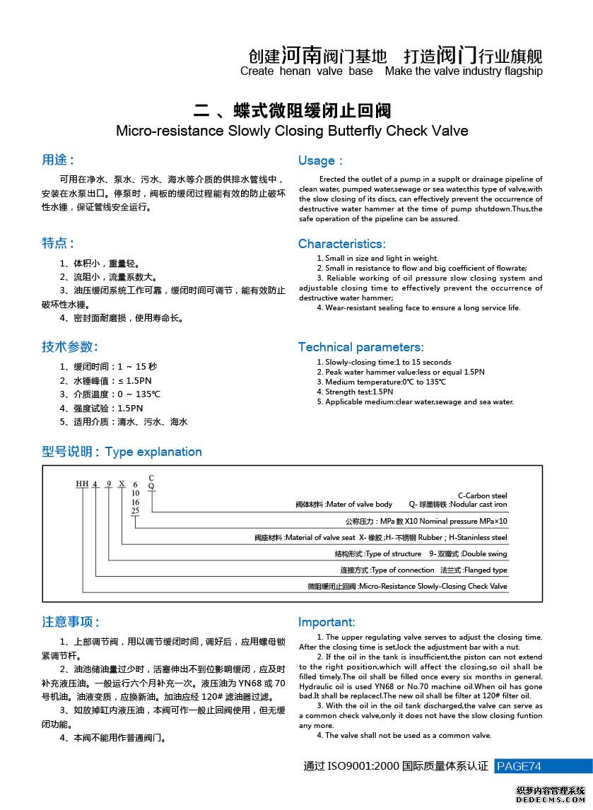 3、油壓緩閉系統(tǒng)工作可靠,緩閉時(shí)間可調(diào)節(jié),能有效防止破壞性水錘。